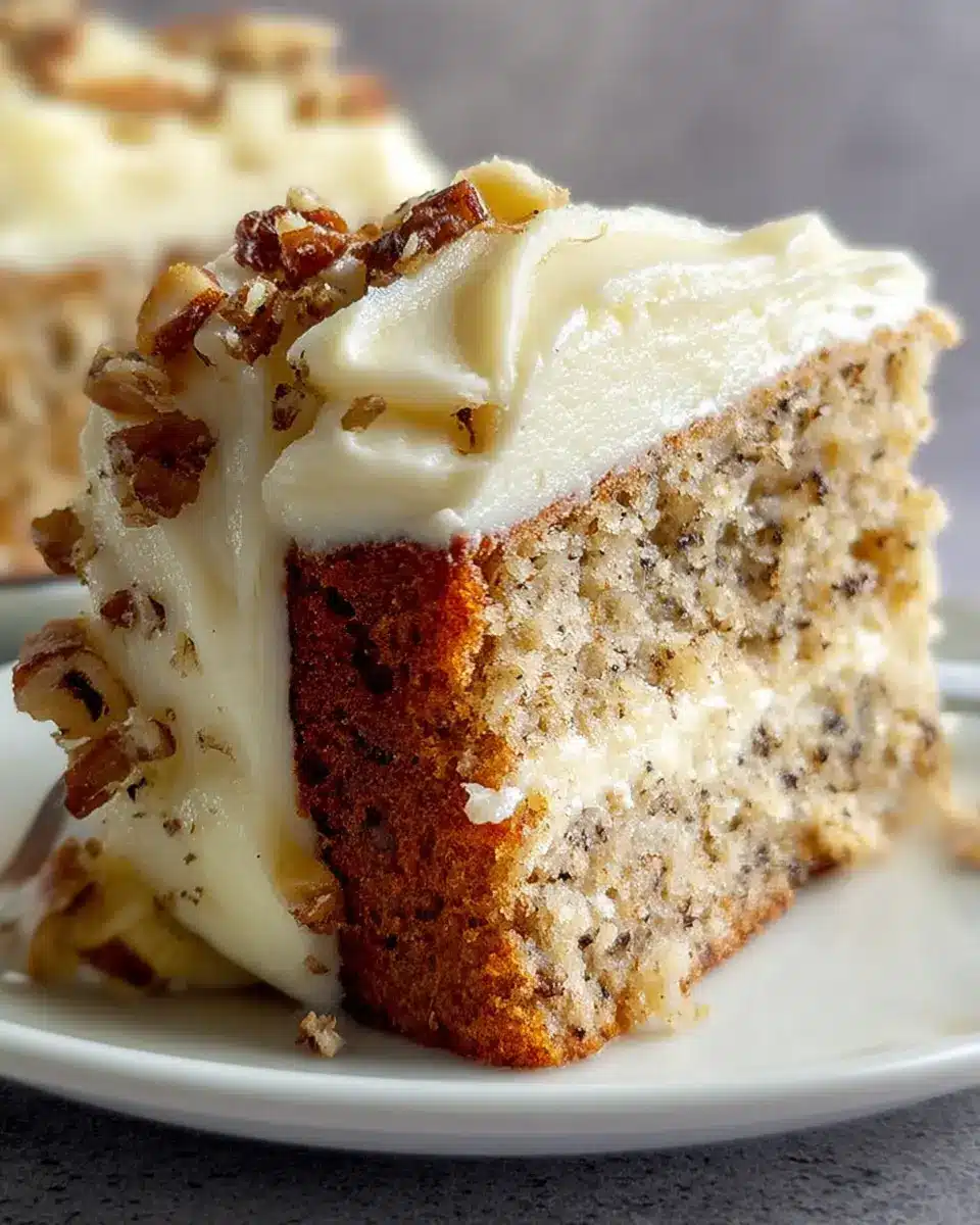Once your cake has completely cooled, it’s time to frost! If desired, you can garnish your amazing banana bread cake with fresh banana slices and chopped walnuts for that extra flair. Slice, serve, and indulge in this incredibly moist and flavorful cake!