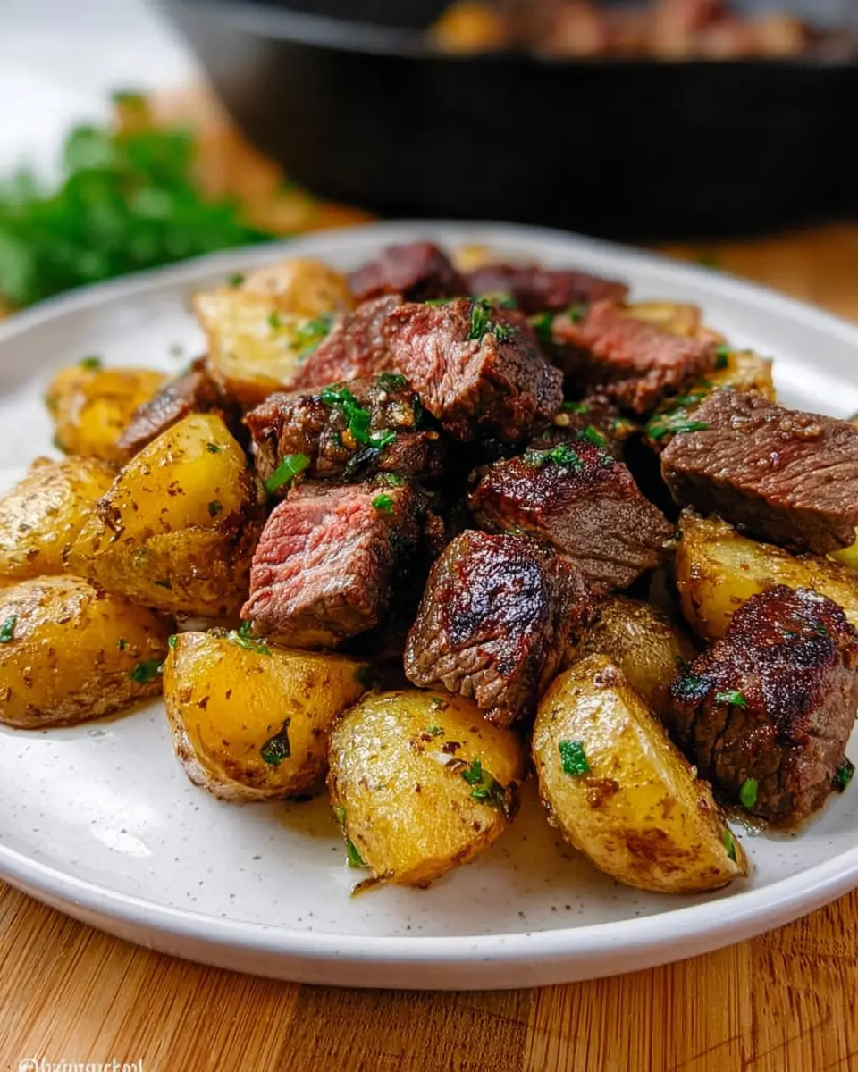 Once the steak is ready, remove the skillet from the heat and toss the cooked potatoes back in. Give everything a good mix to combine those irresistible flavors. If you're feeling fancy, sprinkle some fresh parsley on top for a pop of color. Your Butter Steak Bites are now ready to be devoured!