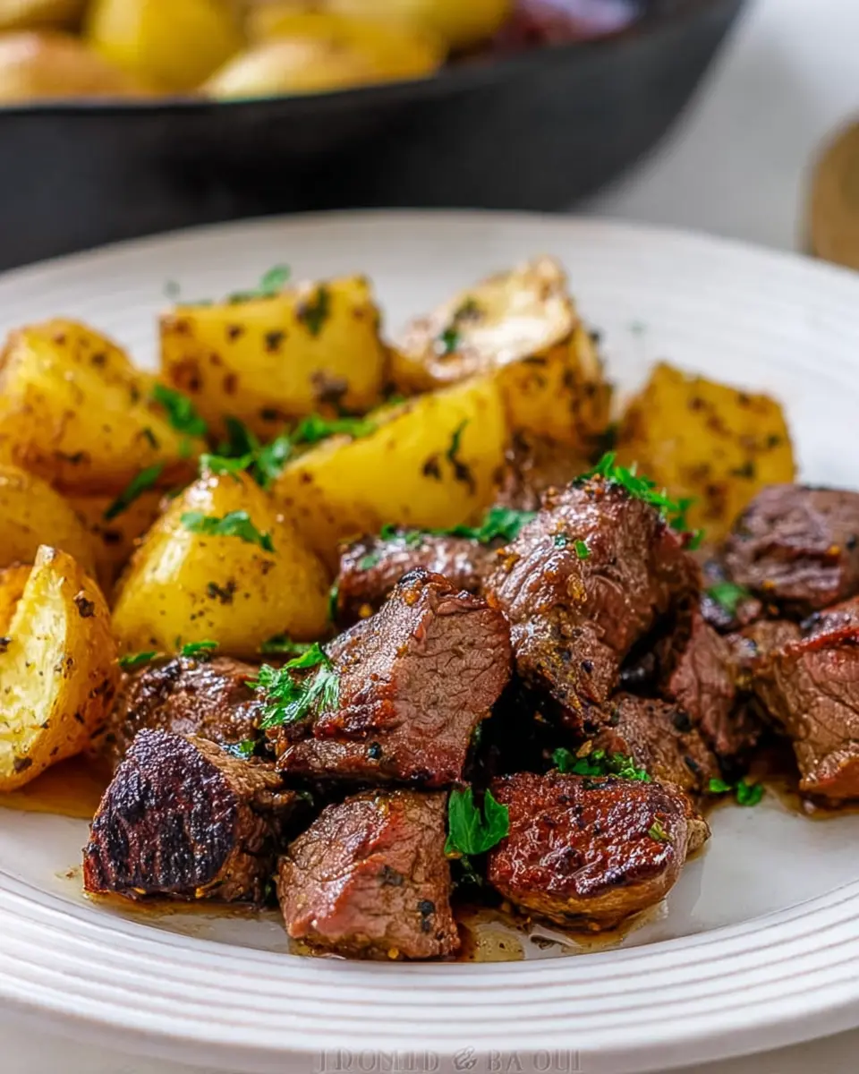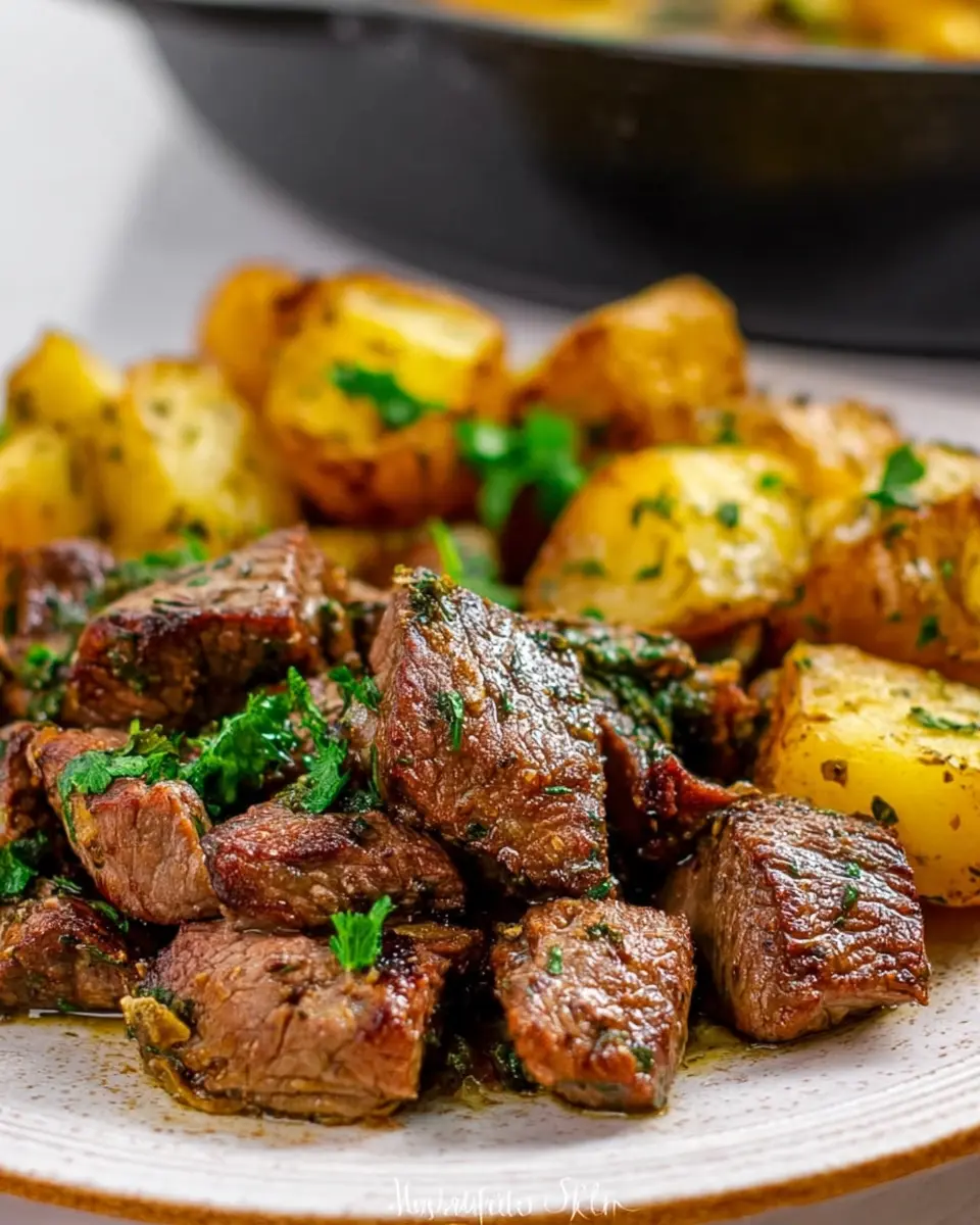 In just 20 minutes, you can enjoy delicious butter steak bites with garlic herb potatoes, making it perfect for a weeknight dinner.