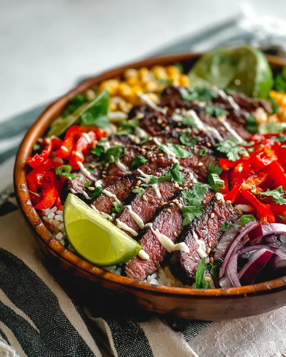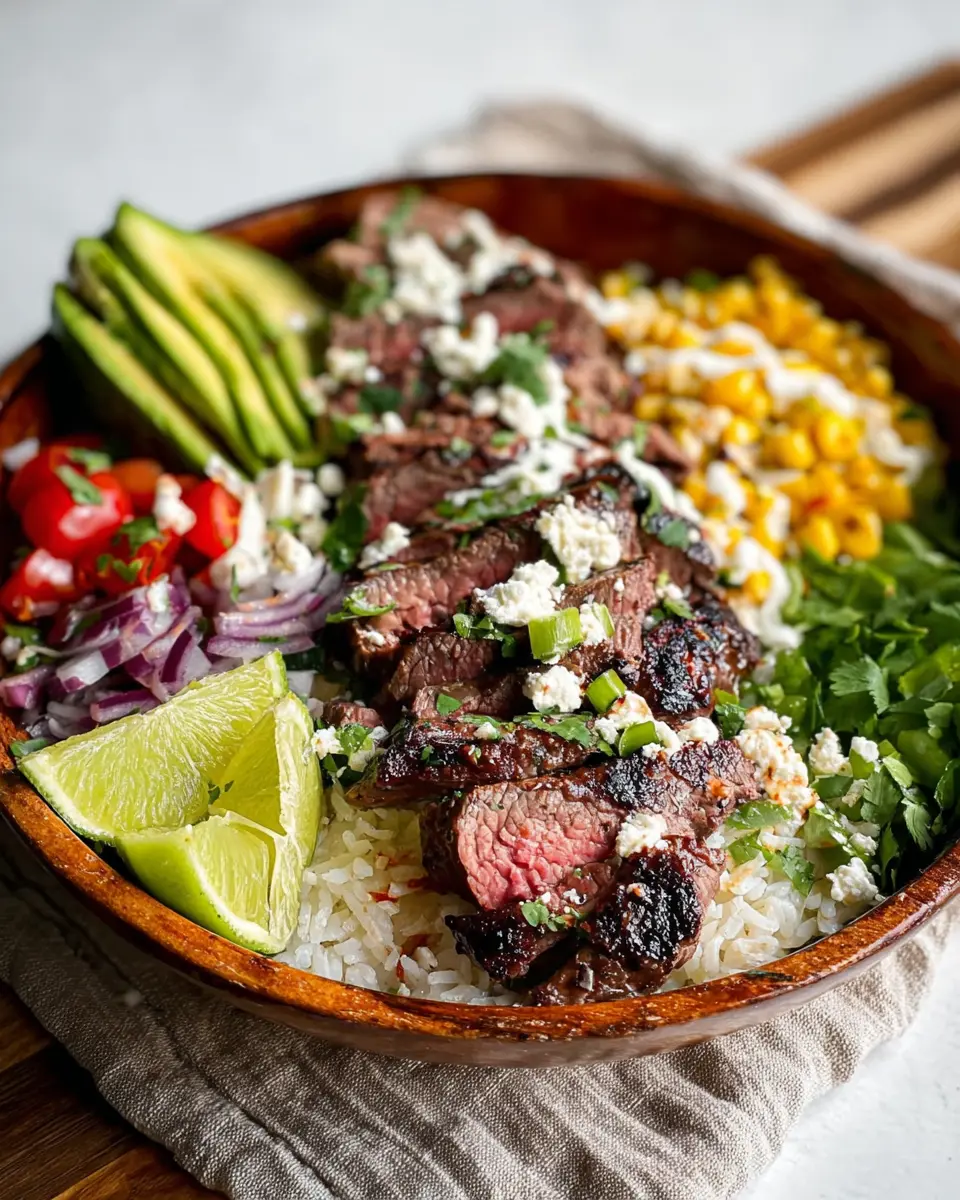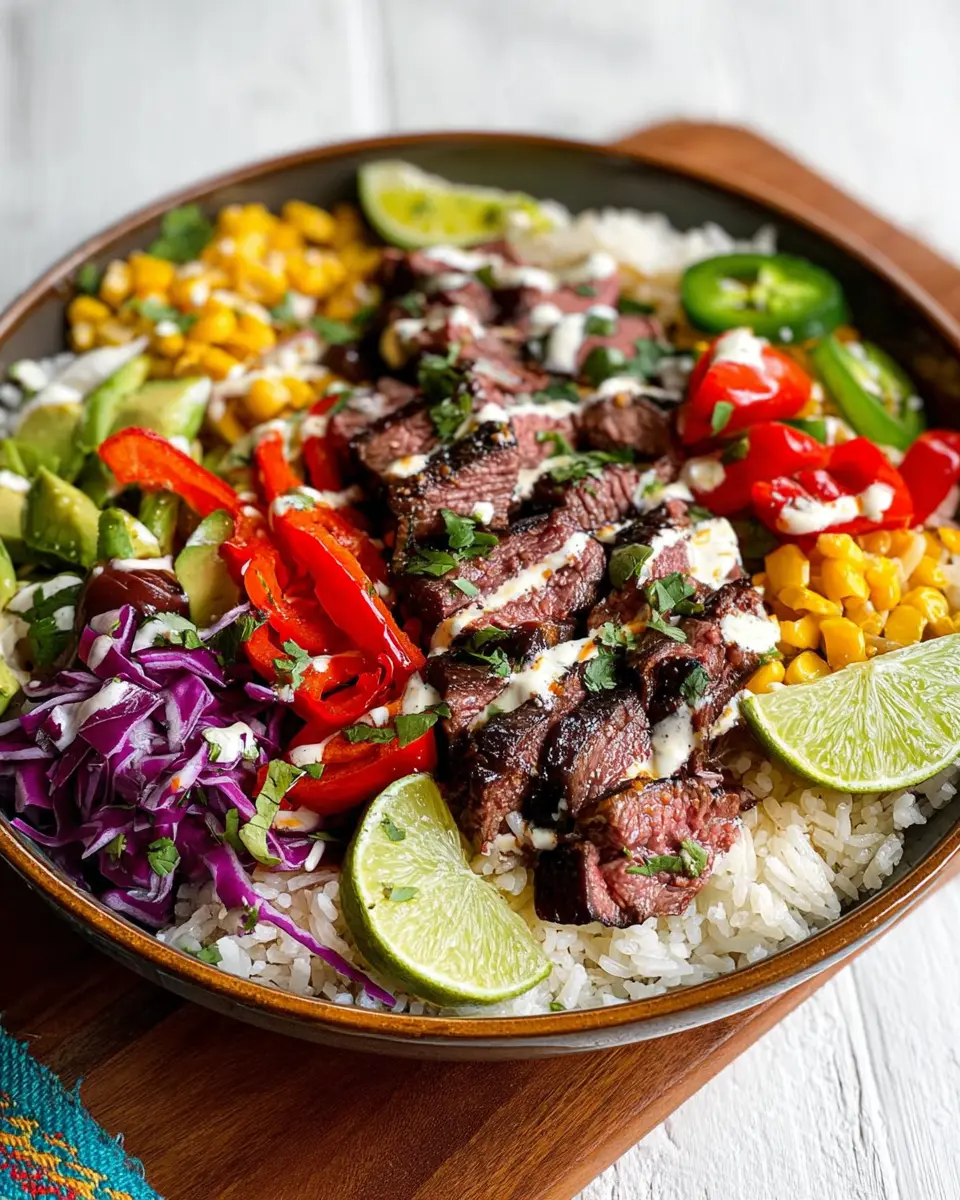 Finally, the fun part—assembling your bowls! Start by adding a base of 4 cups of cooked rice (or riced cauliflower for a low-carb option). Then, top with your sliced steak, along with sliced avocados, heated black beans, corn, 1 cup of shredded cheddar cheese, and some diced red onion. Don’t forget to drizzle your creation with a homemade lime crema made from 1 cup of sour cream, 2 teaspoons of Tajin seasoning, and juice from 1 lime for that perfect finishing touch!