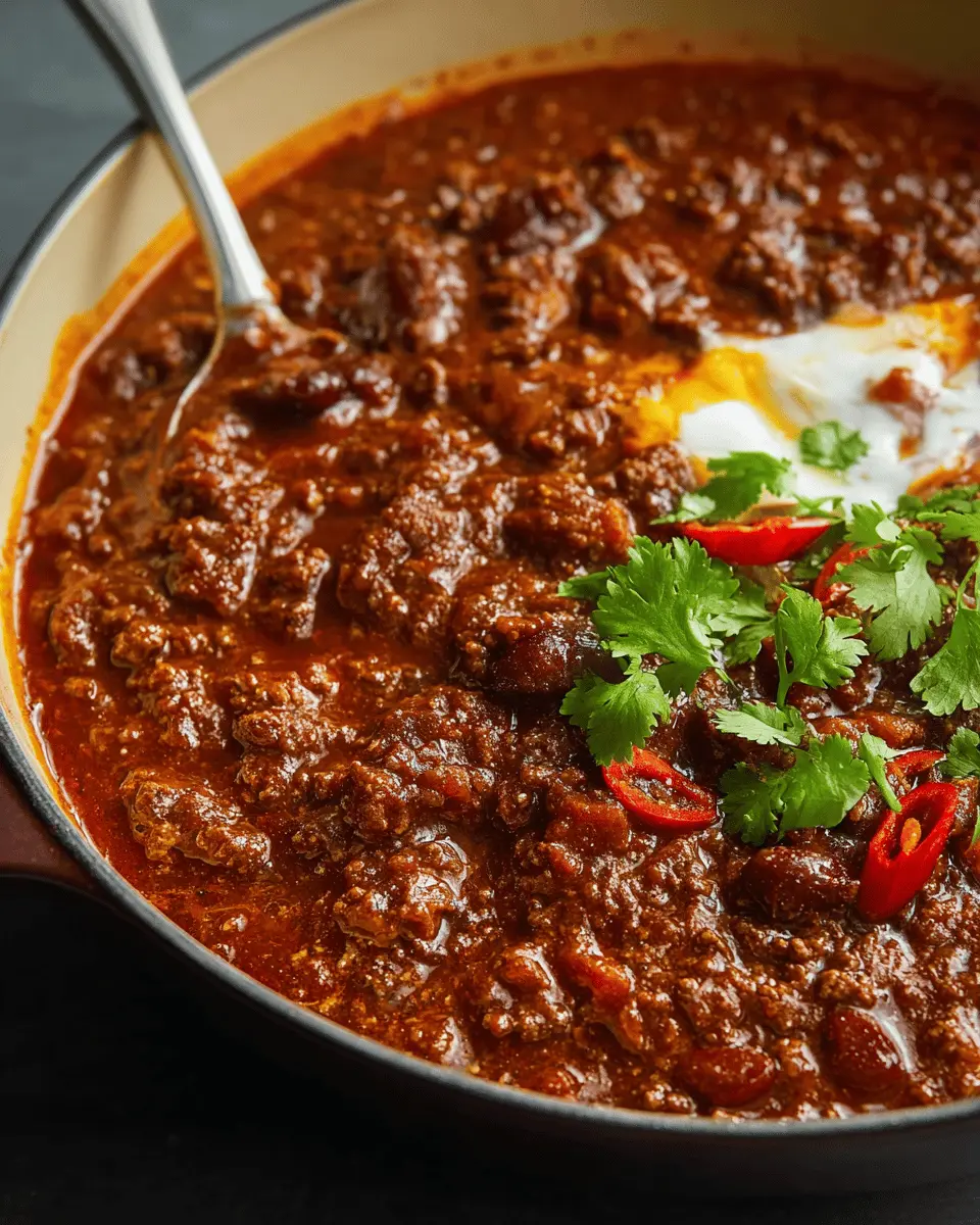 Now, it’s time to ladle your classic beef chili into bowls and set up your toppings—think sour cream, shredded cheddar, or fresh cilantro. Enjoy the wonderful warmth this dish brings!