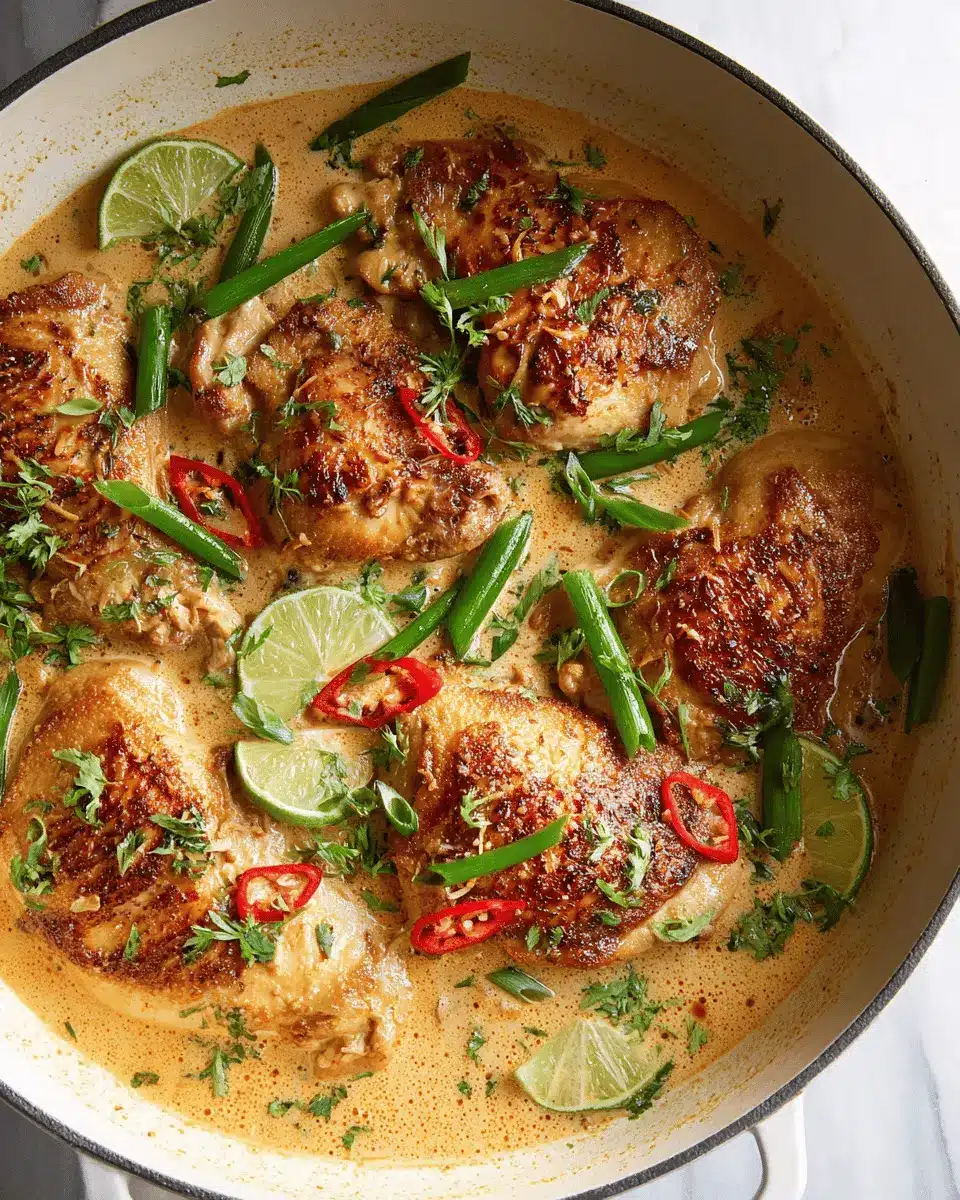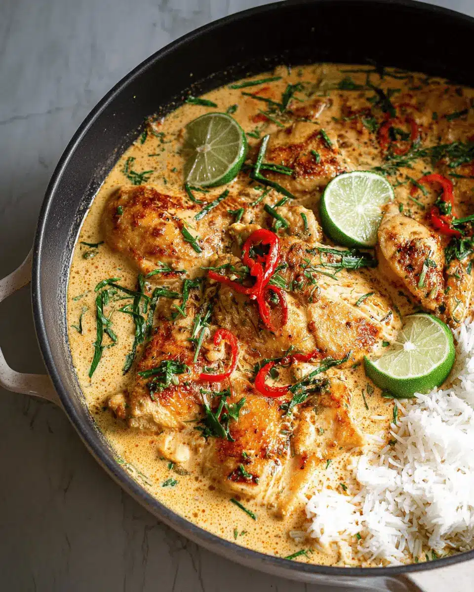 Finally, return the chicken to the skillet. Cover and let it cook for another 1-2 minutes until the chicken is fully cooked and heated through. Serve up your creamy coconut milk chicken garnished with fresh cilantro, a sprinkle of red pepper flakes, and an extra squeeze of lime juice. Accompany this dish with steamed rice or veggies for a complete meal.