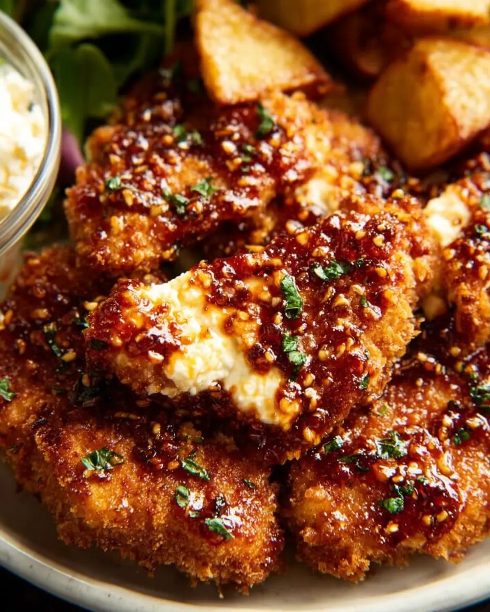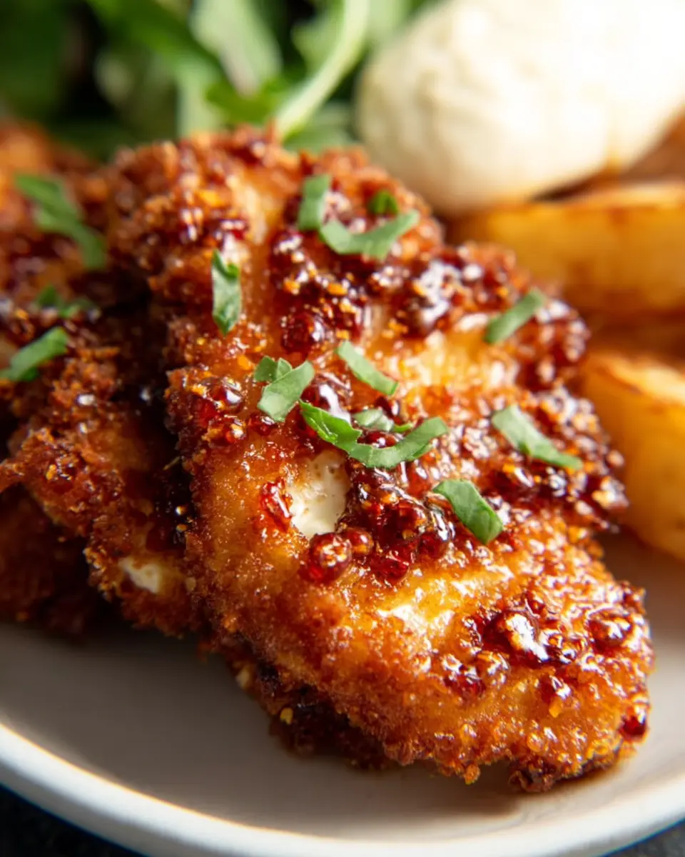 Serve your Crispy Hot Honey Feta Chicken drizzled with the hot honey sauce, and enjoy a meal that’s bursting with flavor and a delightful kick. For a complete meal experience, pair it with some fresh salad or potato wedges. Happy cooking!