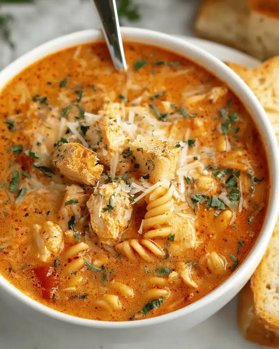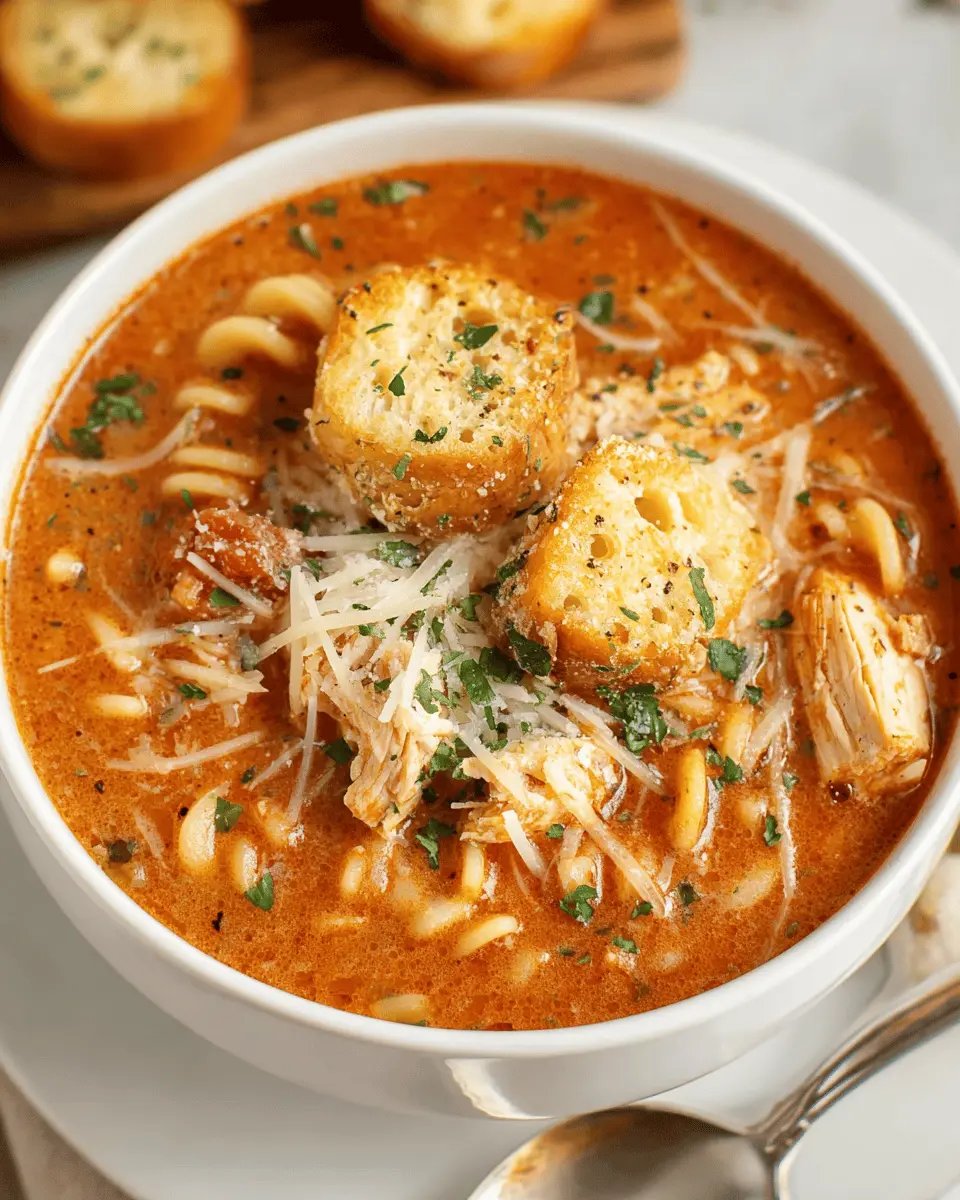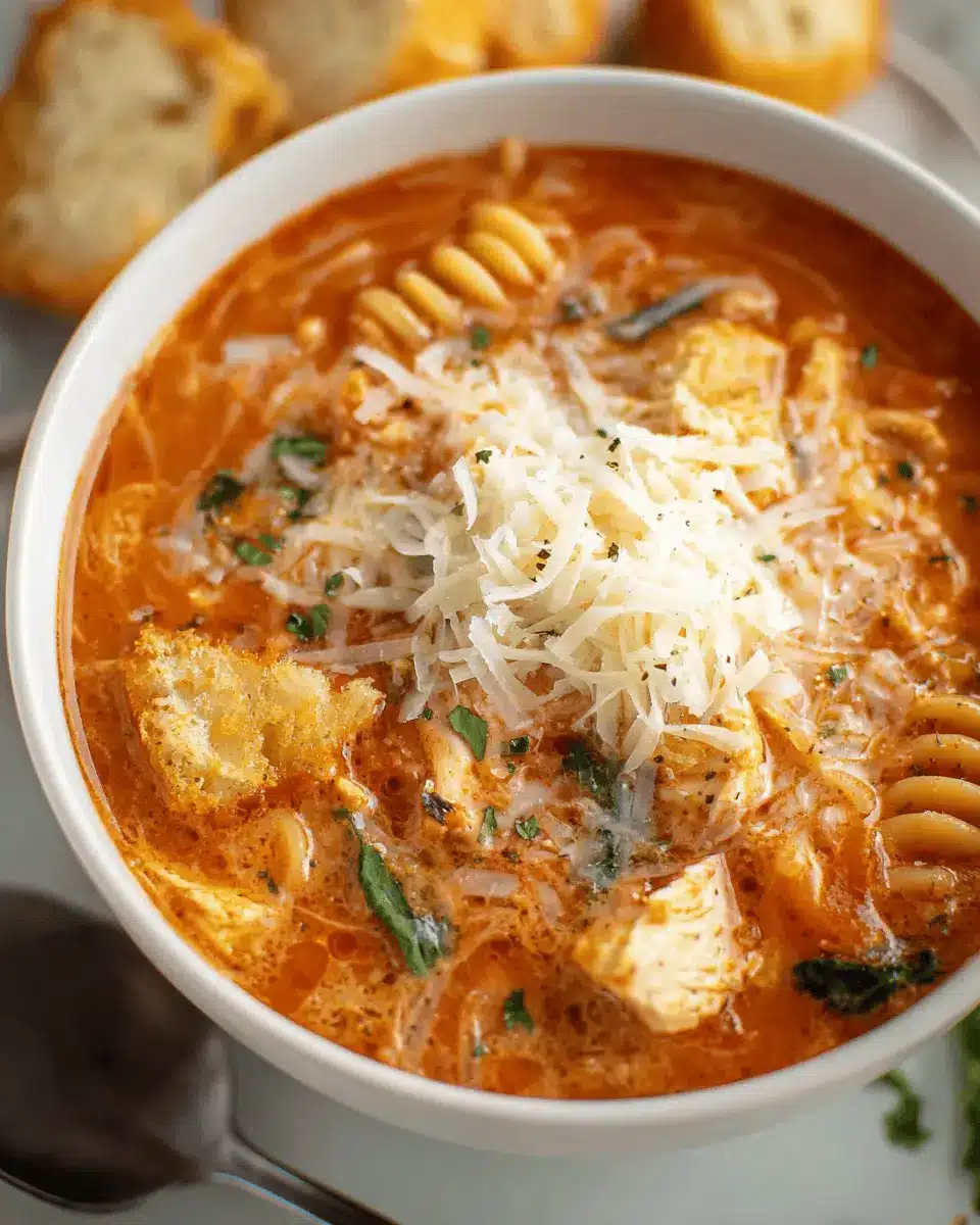 Don’t forget about garnishes! Top your Crockpot Chicken Parmesan Soup with a generous sprinkle of fresh basil or parsley for a pop of color and flavor. For cheese lovers, a little extra shredded mozzarella or shaved parmesan can take it to the next level. A drizzle of balsamic glaze also adds a lovely sweetness that balances the savory notes perfectly, elevating your meal to a delightfully savory experience.