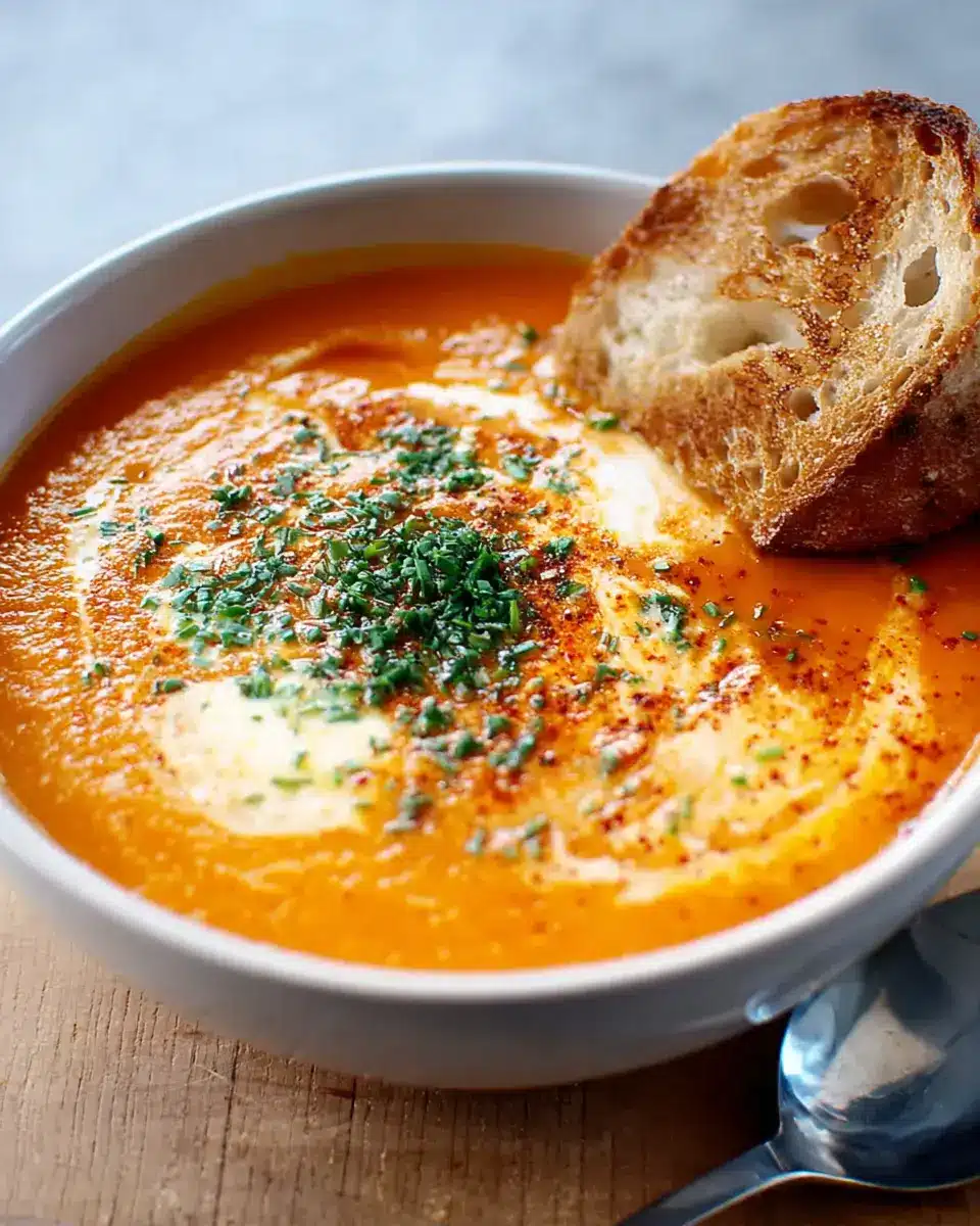 Now for the best part—serving your easy carrot soup! Ladle the hot soup into bowls. For an elegant touch, swirl in a tablespoon of heavy cream in each bowl. Garnish with a pinch of paprika and fresh minced chives, then serve with your cheesy toast dippers. If you have any leftover soup, it keeps well in the fridge for up to five days, or you can freeze it for up to six months. Just remember to add the cream fresh upon serving for the best flavor!