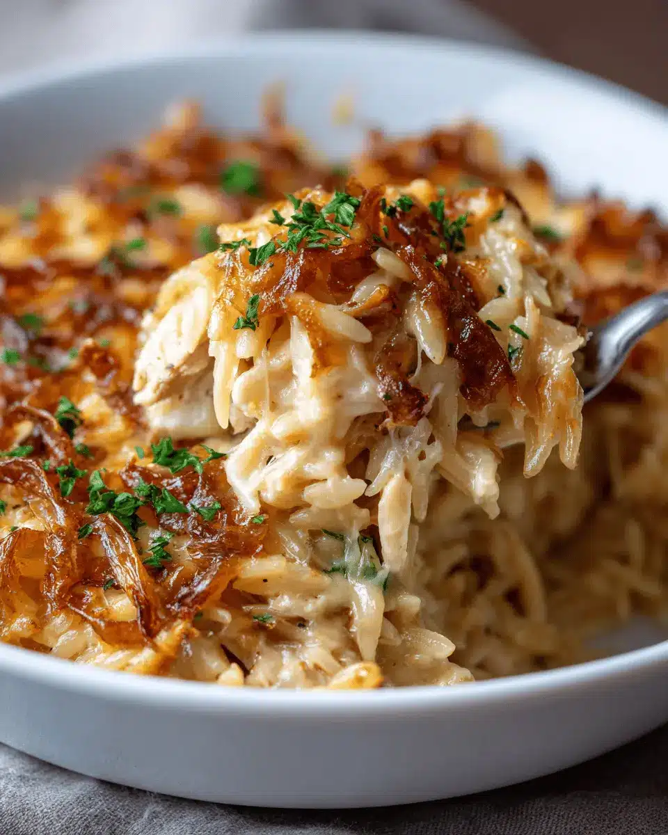 French Onion Chicken Orzo Casserole