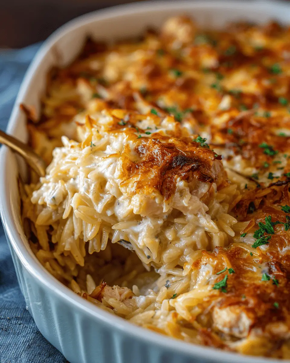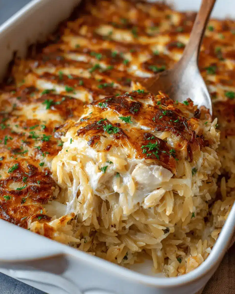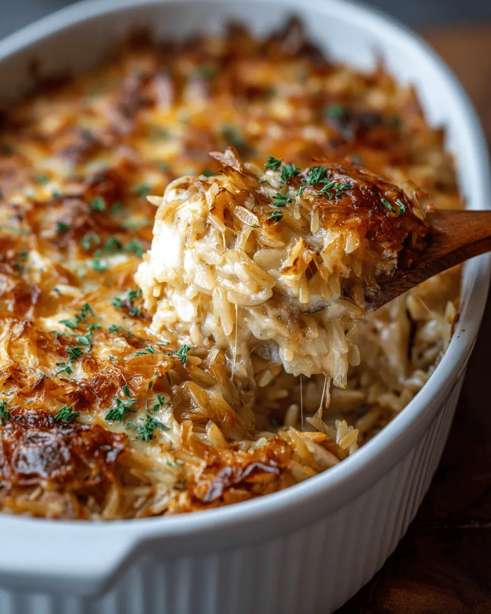 French Onion Chicken Orzo Casserole