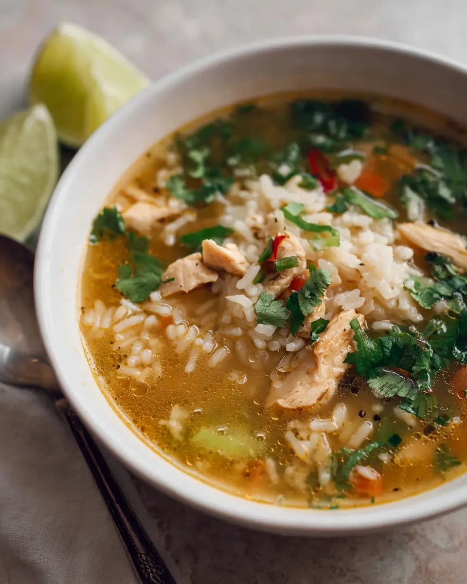 - To serve, scoop the rice into a bowl and ladle the soup over it. Top with fresh cilantro and serve with extra lime wedges.