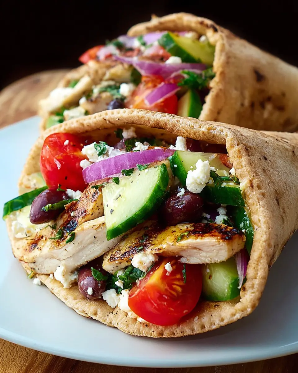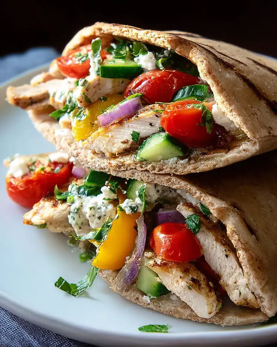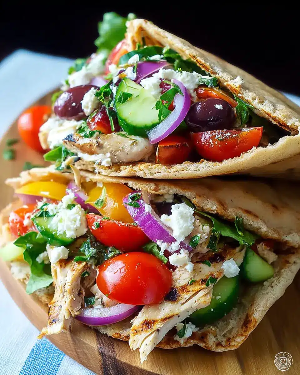 Finally, the moment you’ve been waiting for—assembling your Greek Salad Pita Pockets! Take 4 whole-wheat pitas, halved and lightly toasted to add a bit of crispiness. Start by stuffing each pita half with the grilled chicken slices, then generously top them with your freshly prepared Greek salad.