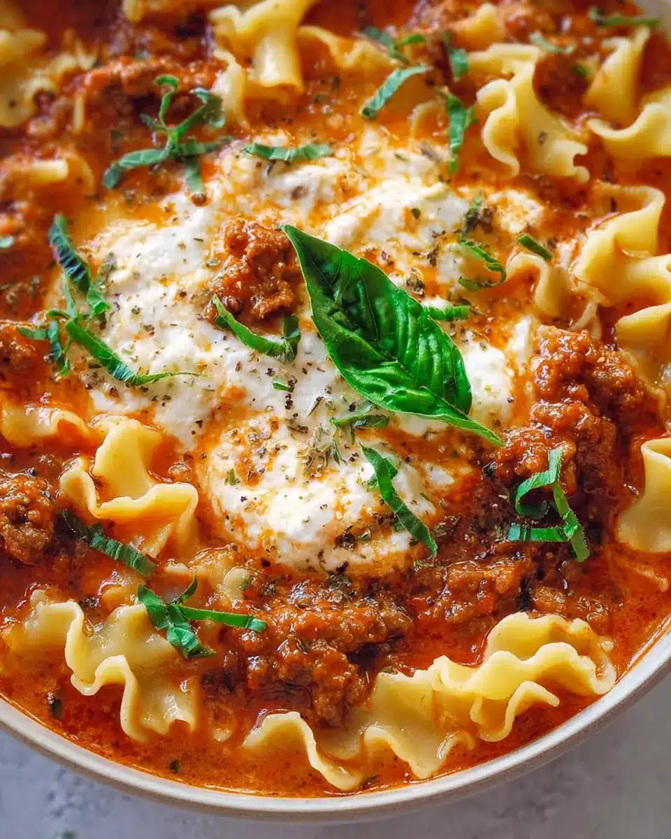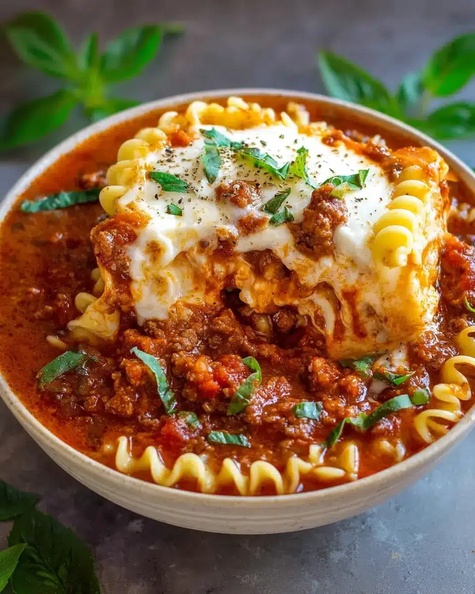 To serve, ladle the piping hot soup into bowls and add a generous dollop of the cheese mixture on top. If you’re feeling fancy, a sprinkle of chopped parsley or fresh basil can add a lovely touch. As you dig in, stir the cheese into the soup for that cozy lasagna experience.