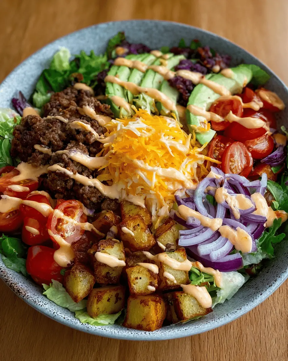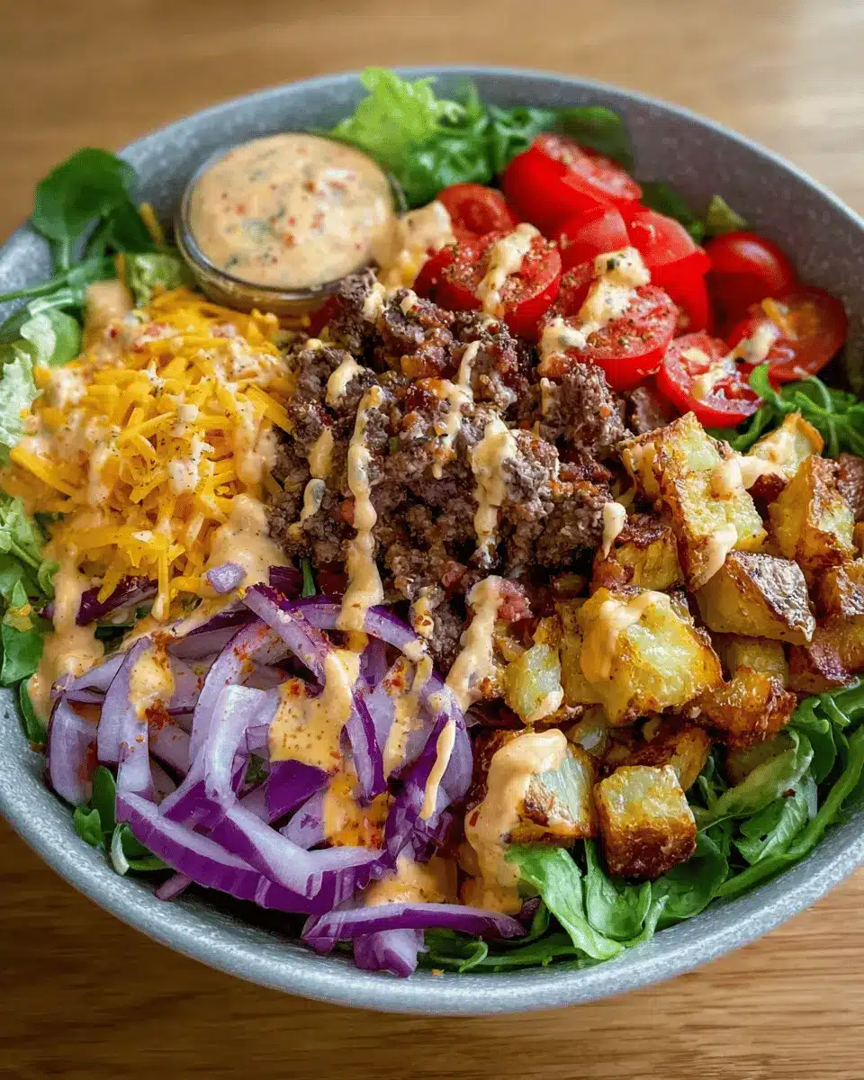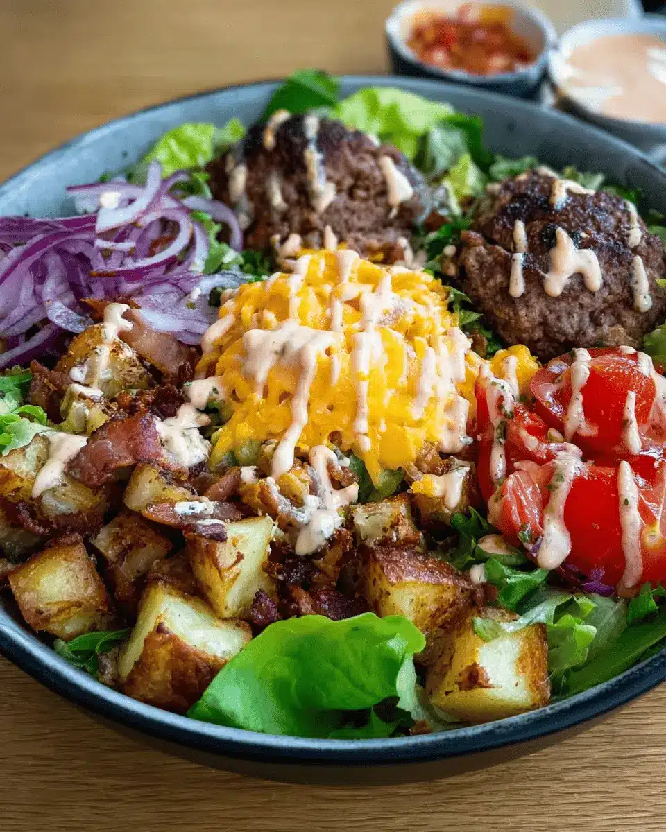 From prep to serving, these mouthwatering bowls will be ready in just 50 minutes. Perfect for busy weeknights when you crave something satisfying without spending hours in the kitchen. For more quick meal ideas, check out this guide to easy weeknight dinners. Enjoy the delicious flavors of a classic burger, all in a hearty bowl!