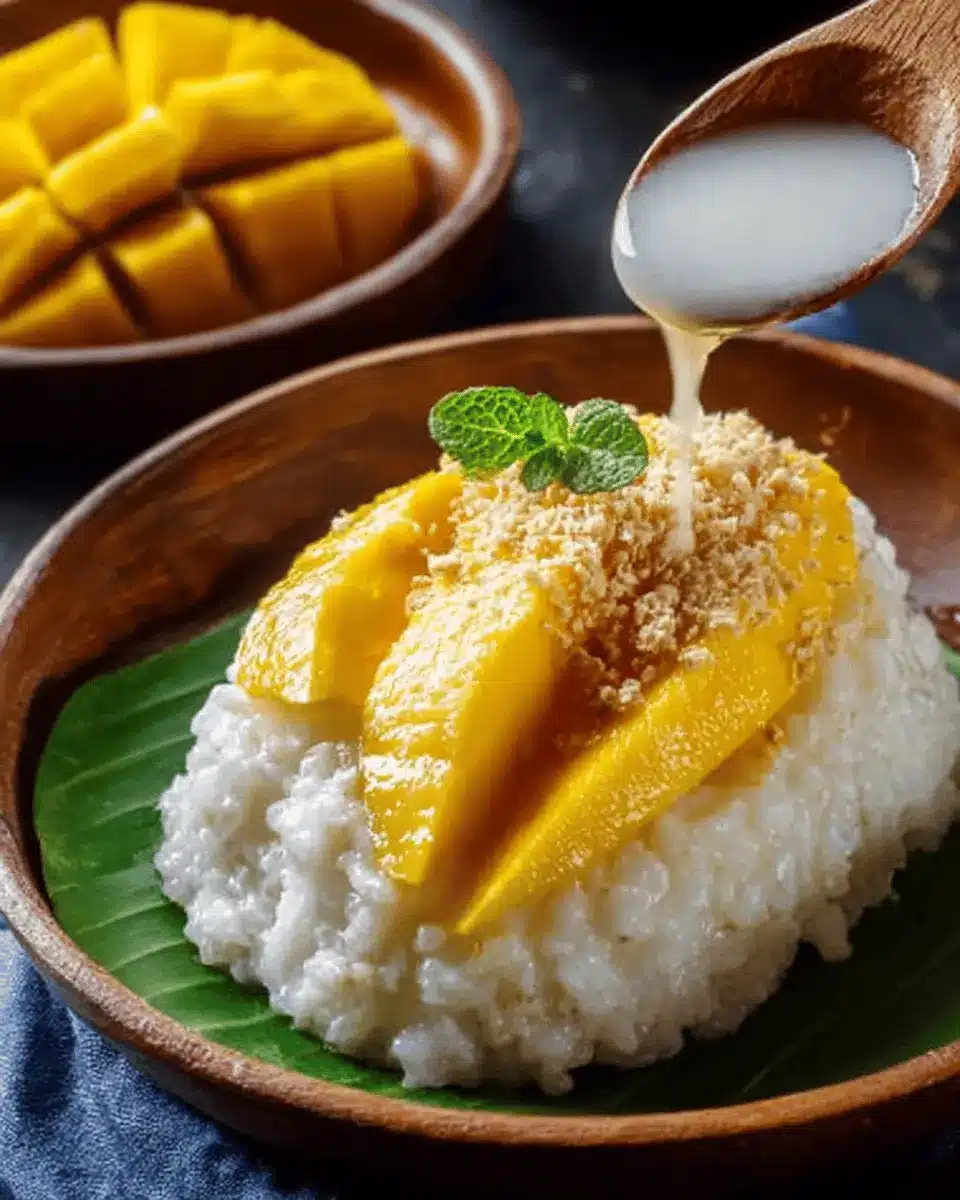 Peel and slice 2 large ripe mangoes, making sure to cut them into nice, even strips. Now it’s time for the fun part! Portion out your sticky rice in serving bowls, then elegantly arrange the mango slices alongside. The contrast of colors will make your dish visually appealing, and trust me—it will taste as good as it looks!