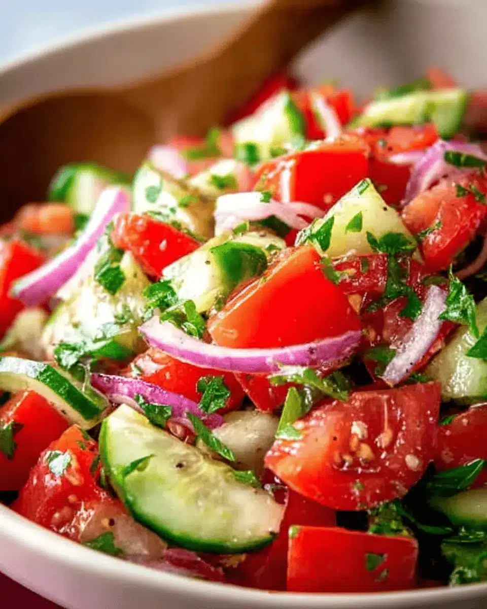 In a large mixing bowl, combine your prepped tomatoes, cucumber, and parsley. If you’re using red onion, add that now as well. Don’t rush this part; gentle handling helps maintain the structure of the vegetables. Sprinkle in a bit of kosher salt and a dash of black pepper to enhance the flavors, then toss everything together lightly. Allow the salad to sit for about 5 minutes, letting the salt draw out some moisture from the tomatoes, which will make the salad even tastier.