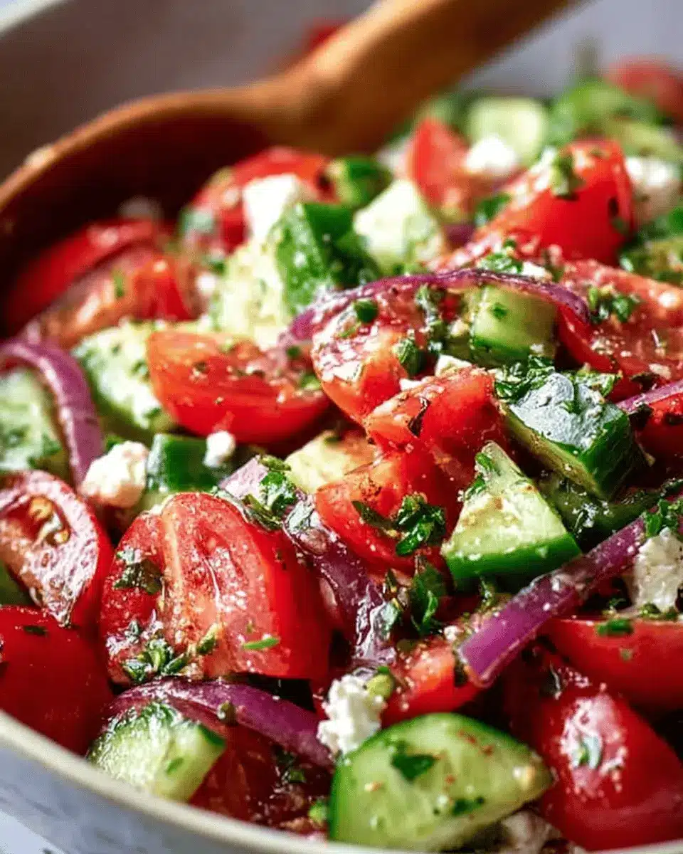 While it's tempting to dig in right away, letting the Mediterranean salad with tomato and cucumber sit for a few more minutes will significantly enhance the flavor. This time allows the ingredients to meld and the salt to further draw out the flavors. If you can, cover the bowl and let it sit in the refrigerator for about 15 minutes before serving. You’ll find that the salad becomes even more vibrant and refreshing after this short waiting period.