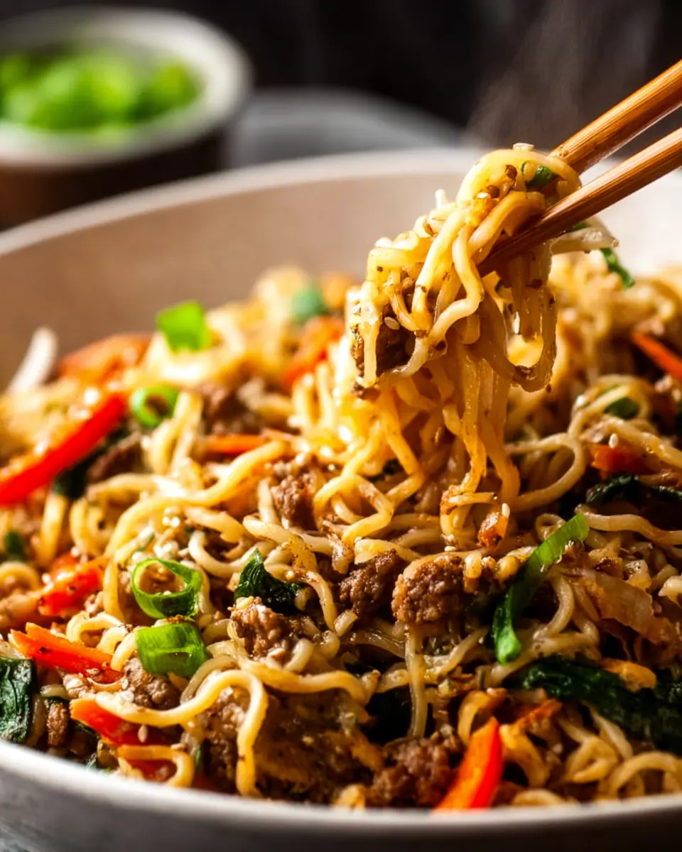You’re almost there! It’s time to bring it all together. Add the cooked ramen noodles and the luscious sauce you prepared earlier to the pan. Toss everything together, ensuring each noodle and vegetable gets coated with that heavenly sauce. Cook for another 2-3 minutes, allowing the flavors to meld beautifully. Garnish your dish with chopped green onions for an added crunch and freshness.
