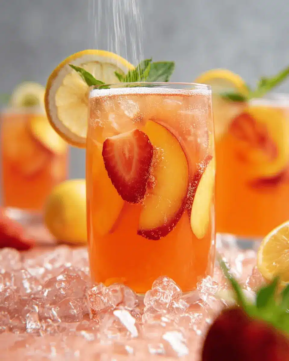 - Instructions: In a large pitcher, fill it with ice, then add the fresh lemon juice, peach and strawberry puree, and simple syrup. Mix well—this step is crucial to ensure every sip is bursting with flavor! Gradually fill the pitcher with cold water, adjusting to your preferred level of sweetness and tartness.