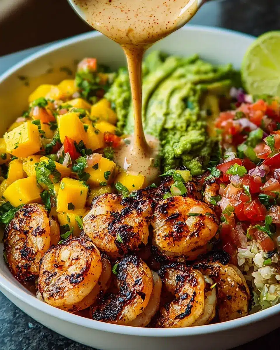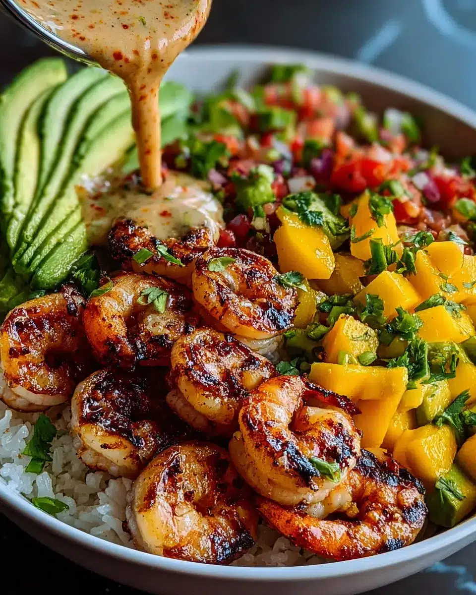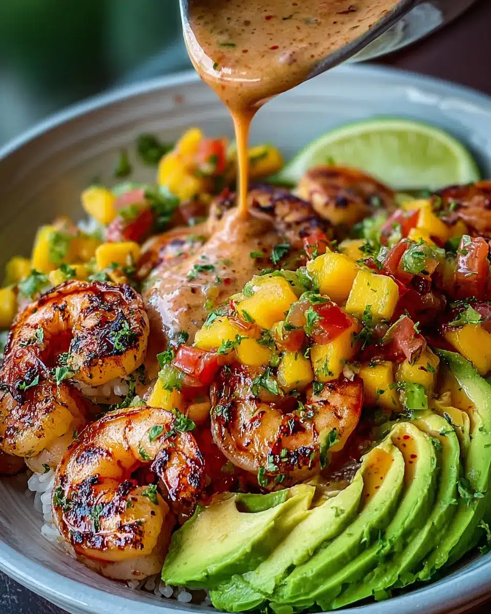 - Assemble the bowls by adding a base of cooked rice or quinoa to each bowl. Arrange grilled shrimp, sliced avocado, and mango salsa on top.