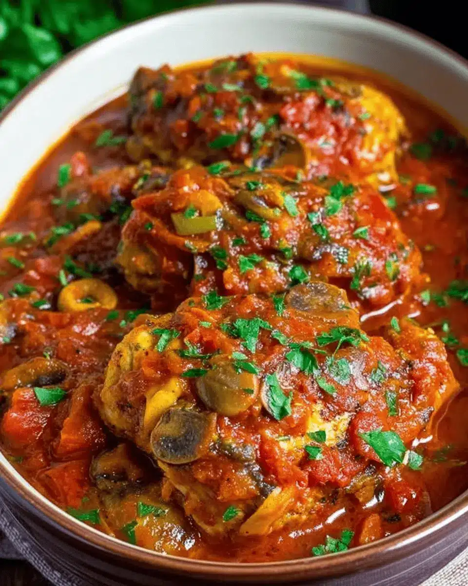 The rich tomato base provides lycopene, an antioxidant linked to heart health. Chicken offers a lean protein source, essential for muscle repair. Olive oil, used here, is known for its healthy fats that can help manage cholesterol levels. For more on the benefits of olive oil, check out Healthline. Fresh vegetables like bell peppers and mushrooms not only add flavor but also contribute vitamins and fiber to your plate, promoting overall well-being!